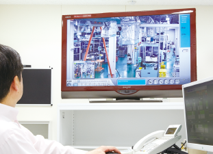自動化から無人化へ——。当社は、IoT、ロボットの導入、設備無人化を図り、スマートファクトリーを実現しています。全拠点・設備をネットワーク化するため、IoTを活用した稼動状況管理システムを自社開発し、すべての加工状況の「見える化」を実現。本社工場、奈良工場にネットワークカメラを17ヵ所設置。いつでもどこでも状況確認でき、夜間無人稼動の遠隔監視も可能にしました。こうして集積した加工データを分析することで、生産スケジュールの調整、設備改善の最適化、現有設備の稼働率向上などを図り、生産効率の向上に役立てています。また、組立工程では、ヒューマノイド・ロボットを試験導入するなど、「無人化」への取り組みも進めています。