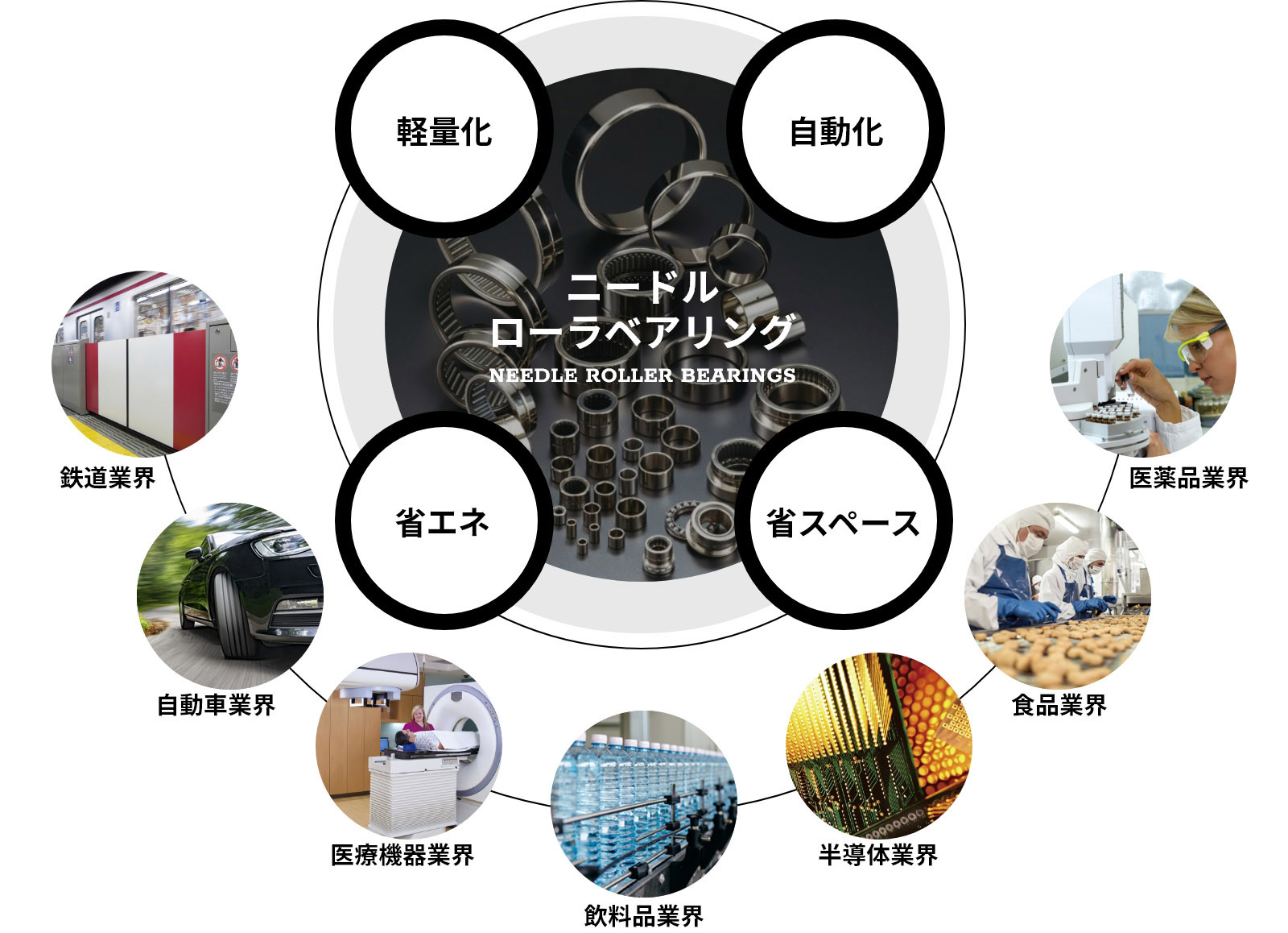 「ベアリング」は、機械の中の軸をなめらかに回転させることで、モノの回転を助ける部品です。日本語では「軸受」と呼ばれ、その名前の通り、主に機械の中で回転する「軸」を支える部品です。「ベアリング」は、内輪と外輪、ボールの3層で構成され、内輪と外輪のあいだにボールがたくさんあり、このボールのことを「転動体」といいます。「ニードルローラベアリング」は、この転動体にニードル(針)状の細いローラを組み込んだ回転運動用のベアリングのことです。ボールベアリングなどと比較して、断面高さが低く、負荷容量が大きいため、耐荷重性に優れているのが特長で、機械全体をコンパクトにでき、省スペース化に貢献する機械要素部品として産業機械、生産設備など幅広い分野で活躍しています。そのため「機械産業のコメ」と呼ばれ、ありとあらゆる機械製品などに利用されています。私たちの日常生活では、あまり高荷重、高精度を求められる場面が少ないので聞いたことがないと思いますが、私たちの身の回りの製品の多くはこの「ニードルローラベアリング」が組み込まれた機械でつくられているのです。